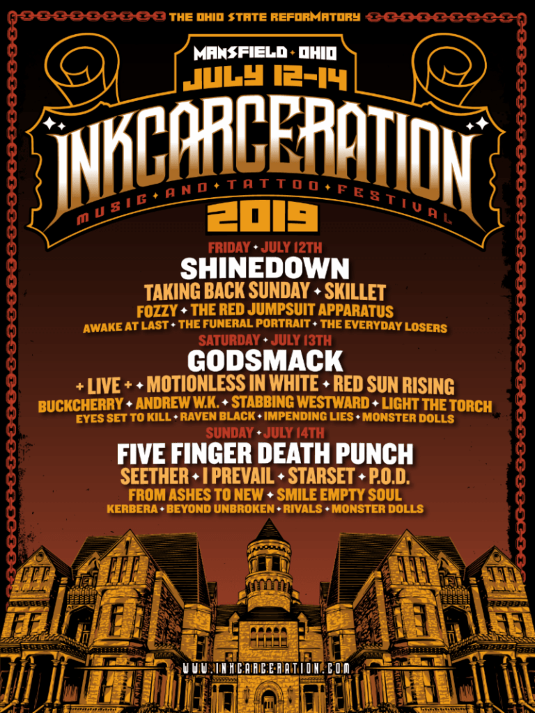 The INKCARCERATION Music and Tattoo Festival recently announced its return to the historic Ohio State Reformatory, a.k.a. Shawshank Prison, in Mansfield, OH, on July 12, 13 and 14. This year’s massive line-up will be led by none other than colossal rock bands Shinedown, Godsmack and Five Finger Death Punch. Quickly becoming one of the nation’s premier rock festivals, INKCARCERATION will feature over 30 bands on two outdoor stages, 70 tattoo artists, reformatory tours, gourmet food trucks, the best drinks and for the first time, the haunted house attraction, Escape from Blood Prison.