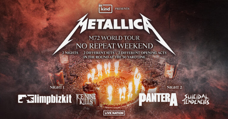Two-night tickets for the newly announced No Repeat Weekends and tickets for the single-night engagements will be on sale September 27 at 10am local time. Fan club pre-sales begin September 23 at 10am local time. For further information, enhanced experiences, travel packages and more, go to https://metallica.lnk.to/ Since opening April 2023 in Amsterdam, M72 has seen Metallica play to some three million fans. Variously hailed as “an altogether life-affirming experience” (Billboard), “impossible to leave unsatisfied” (Austin Chronicle), “a stone-cold stunner of a show” (Detroit News), “the mother of all summer concerts” (Worcester Telegram Gazette) and “as tight and furious as Metallica has sounded in ages” (Los Angeles Times), M72 continues to amaze fans and critics alike. The tour will conclude its triumphant 2024 run with four nights at Mexico City’s Estadio GNP Seguros, where Metallica will play to more than 250,000 fans over the course of two No Repeat Weekends. The M72 World Tour’s 2025 itinerary will continue the hallowed No Repeat Weekend tradition, with each night of the two-show stands featuring entirely different setlists and support lineups. These will include the band’s first Nashville shows in five years on May 1 and 3 at Nissan Stadium, as well as Metallica’s return to Tampa after 15 years on June 6 and 8 at Raymond James Stadium. M72 has also confirmed its much anticipated Bay Area hometown play, to take place June 20 and 22 with the band’s debut performances at Levi’s Stadium in Santa Clara. In a new twist, M72 2025 will feature several single shows bringing the tour’s full production, with its massive in-the-round stage, to venues including two college football stadiums: JMA Wireless Dome in Syracuse, New York on April 19, and Metallica’s first ever visit to Blacksburg, Virginia, home of the Virginia Tech Hokies. The May 7 show at Lane Stadium will mark the culmination of 20+ years of “Enter Sandman” playing as the Hokies take the field. In addition to playing football stadiums across the nation, the M72 World Tour’s 2025 itinerary will also include two festival headlines—the first being the opening night of the run April 12 at Sick New World at the Las Vegas Festival Grounds. May 9 and 11 will then mark a festival/No Repeat Weekend combo as Metallica plays two headline sets at Sonic Temple at Historic Crew Stadium in Columbus, Ohio. Support on M72’s 2025 North American run will come from Pantera, Limp Bizkit, Suicidal Tendencies and Ice Nine Kills. See below for specifics. Additionally, M72 2025 will see Metallica’s long-awaited return to Australia and New Zealand. Stay tuned to https://www.metallica.com/ for further announcements. M72’s 2025 North American leg is produced by Live Nation and presented by new sponsor inKind. inKind rewards diners with special offers and credit back when they use the app to pay at 2,000+ top-rated restaurants nationwide. The company provides innovative financing to participating restaurants in a way that enables new levels of sustainability and success. Metallica fans can learn more at inkind.com. Citi is the official card of the M72 tour. Citi cardmembers will have access to presale tickets beginning Tuesday, September 24 at 10am local time until Thursday, September 26 at 10pm local time through the Citi Entertainment program. For complete presale details visit www.citientertainment.com. Verizon will offer an exclusive presale for the M72 tour in the U.S through Verizon Access, just for being a customer. Verizon Access Presale tickets for select shows will begin Tuesday, September 24 at 10am local time until Thursday, September 26 at 10pm local time. For more details visit Verizon.com/Access. * Citi and Verizon presales will not be available for Sick New World, Sonic Temple or the Toronto dates. Verizon presale will not be available for the Nashville, Blacksburg or Landover shows. As always, a portion of proceeds from every ticket sold will go to local charities via the band’s All Within My Hands foundation. Established in 2017 as a way to give back to communities that have supported Metallica over the years, All Within My Hands has raised over $15 million – providing $8.2 million in grants to career and technical education programs including the ground-breaking Metallica Scholars Initiative, now in its sixth year, over $3.6 million to combat food insecurity, more than $3.5 million to disaster relief efforts. METALLICA M72 WORLD TOUR North America 2025 April 12 Las Vegas, NV Sick New World @ Las Vegas Festival Grounds April 19 Syracuse, NY JMA Wireless Dome * April 24 Toronto, ON Rogers Centre * April 26 Toronto, ON Rogers Centre + May 1 Nashville, TN Nissan Stadium * May 3 Nashville, TN Nissan Stadium + May 7 Blacksburg, VA Lane Stadium * May 9 Columbus, OH Sonic Temple @ Historic Crew Stadium May 11 Columbus, OH Sonic Temple @ Historic Crew Stadium May 23 Philadelphia, PA Lincoln Financial Field + May 25 Philadelphia, PA Lincoln Financial Field * May 28 Landover, MD Northwest Stadium * May 31 Charlotte, NC Bank of America Stadium * June 3 Atlanta, GA Mercedes-Benz Stadium * June 6 Tampa, FL Raymond James Stadium + June 8 Tampa, FL Raymond James Stadium * June 14 Houston, TX NRG Stadium * June 20 Santa Clara, CA Levi’s Stadium + June 22 Santa Clara, CA Levi’s Stadium * June 27 Denver, CO Empower Field at Mile High + June 29 Denver, CO Empower Field at Mile High * * Pantera and Suicidal Tendencies support + Limp Bizkit and Ice Nine Kills support |