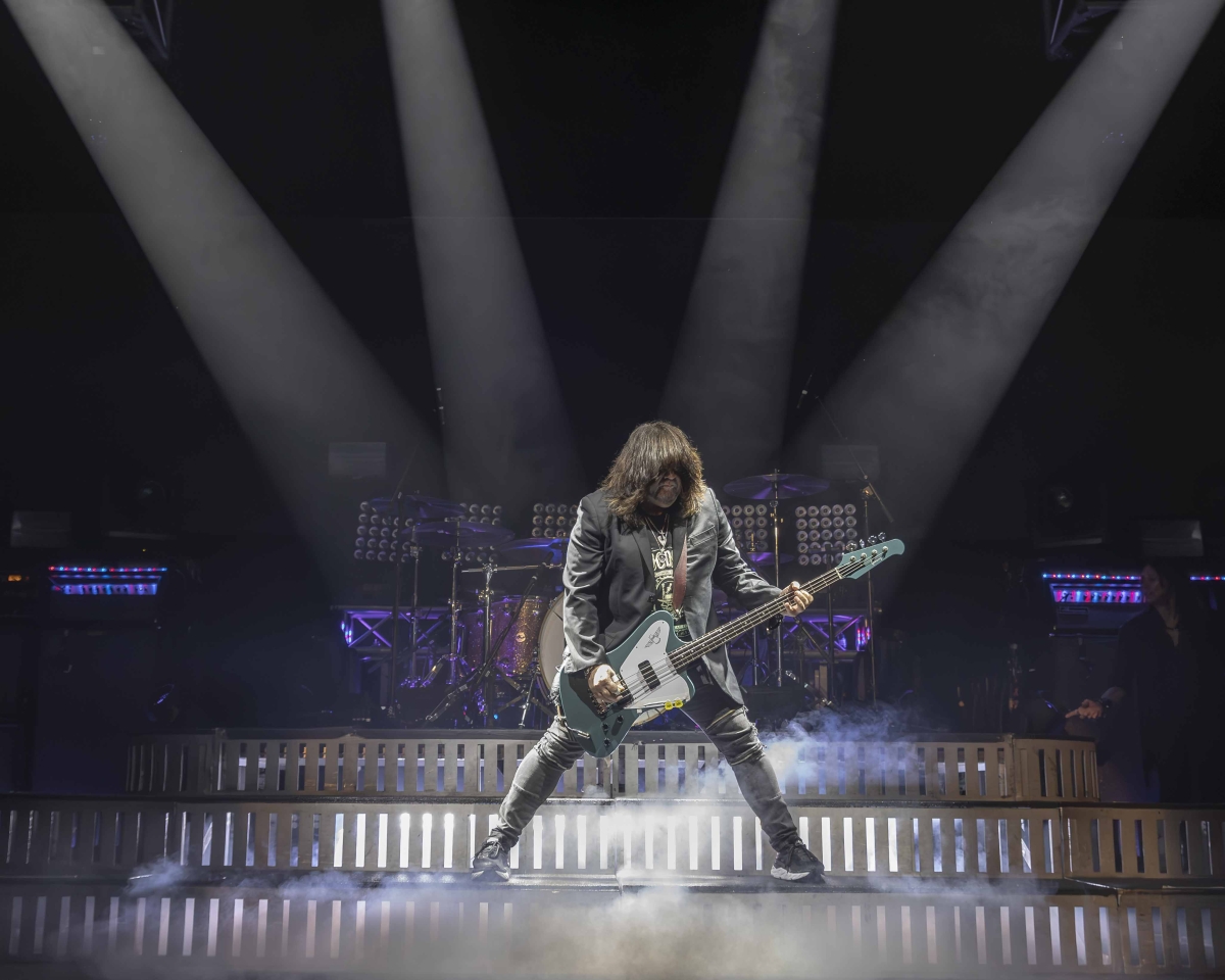 With the capacity crowd singing along to the classic rock hits pumped through the house PA, the sense of excitement on everyone was palpable. After all a Friday night and one of the greatest rock acts to come out of the early eighties is a pretty heady combination. Finally, the moment arrived that everyone was waiting for, the house lights dimmed, and Tesla’s emblem was emblazoned on the video screens behind the drum kit. Finally, the band came out on stage. As the stage lights came up they launched into “Lady Luck” from their hit album The Great Radio Controversy. Seconds into the song it was obvious the band brought their A game. Between their recent residency in Las Vegas, and their time on the just docked Monsters Of Rock Cruise they were razor sharp and tight. Throughout the song the video screens behind the band was displaying roulette wheels, cards, dice and of course women. It suited the song to a tee.