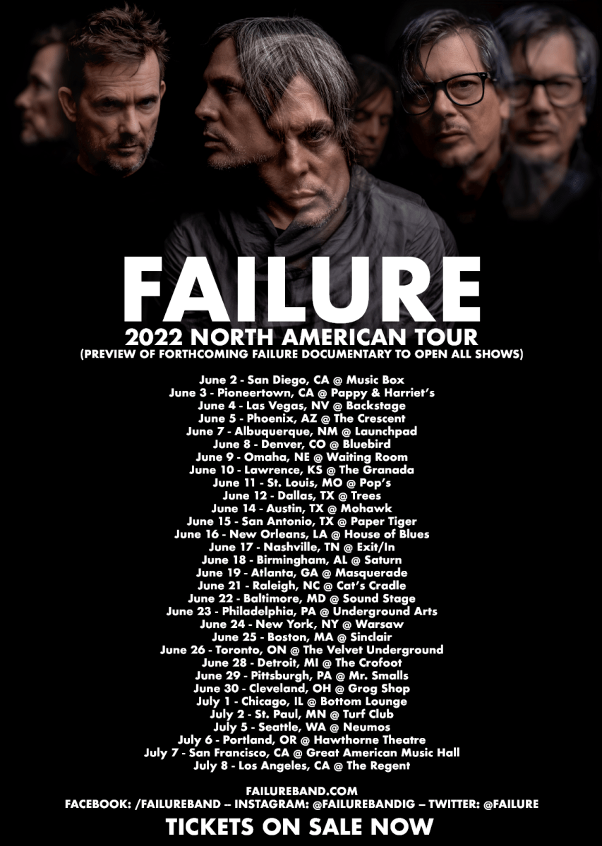 The dates, which kick off on June 2 in San Diego and run for five weeks before culminating in a hometown show at Los Angeles’ Regent Theatre, are on-sale today at 10 am local time. All shows will open with a special preview of the forthcoming Failure documentary.