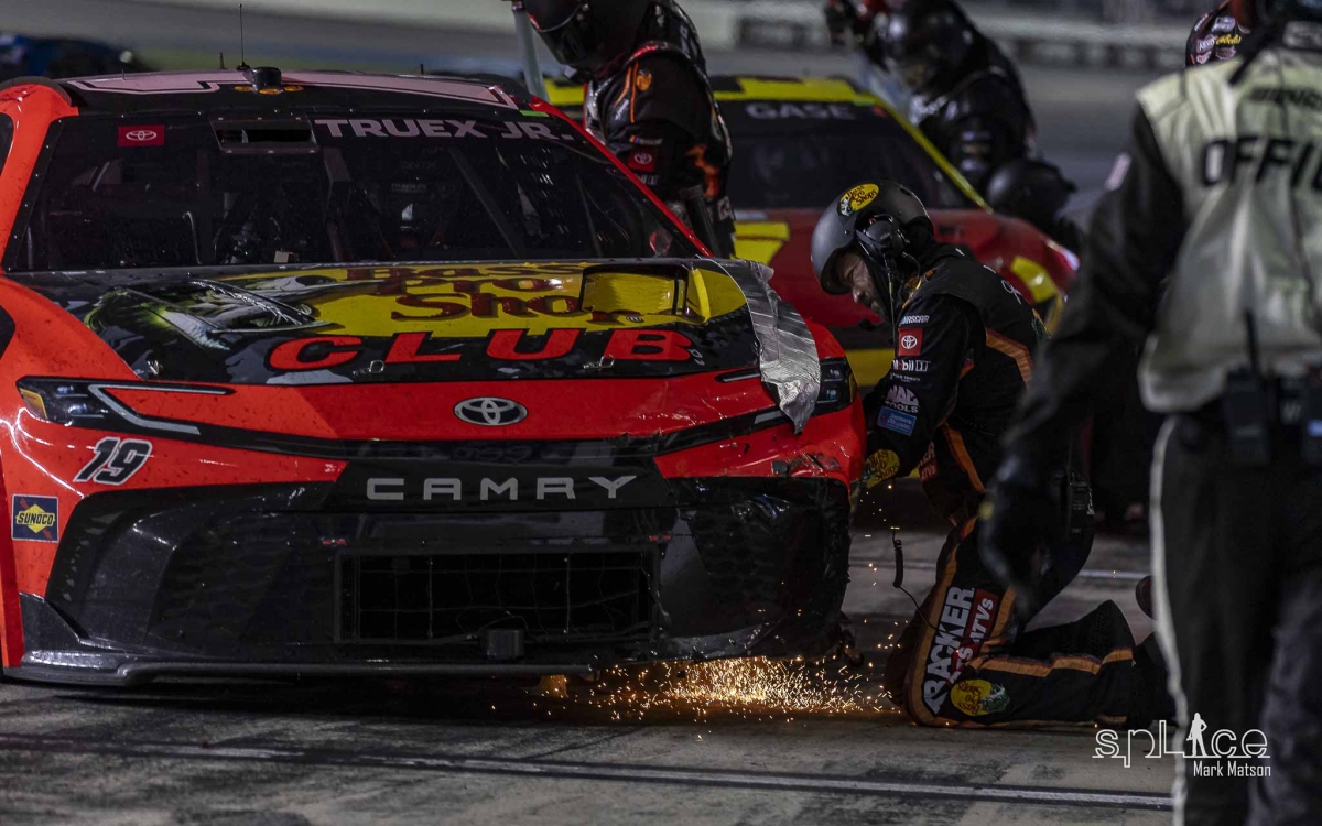 With the all the teams coming onto pit row for fresh rubber and fuel it seemed as though the race would be a cool calculated event  based on how everyone had been driving. But the drama would soon start as the back of Daniel Suarez’s car was set ablaze as fuel that had spilled during his pit stop was ignited by another cars exhaust as it drove by. Thankfully, Suarez and his pit crew were fine, but his car was knocked out of the race on lap 37.
