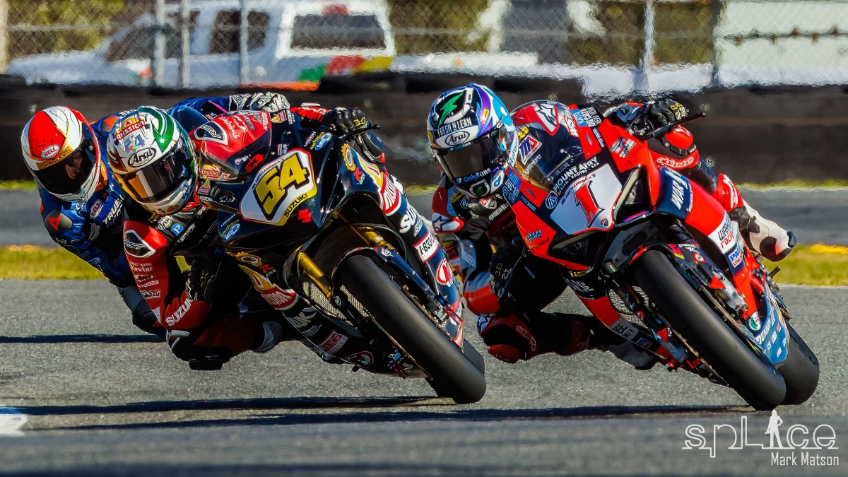 When the green flag was finally waved, Josh Herrin got the perfect start powering his Ducati Panigale V2 into the lead. Over the next thirty laps the top twelve riders would stay bunched up, with the exception of Cam Petersen oh his Attack Yamaha. Shifting problems would cause him to go a lap down to the leaders as his team straightened things out. On lap thirty three things started to break open. PJ Jacobsen on the Celtic/Tylers Cycle/TSE Racing Yamaha, who qualified second, crashed out in the infield section finishing his day. A couple of laps later Hayden Gillim on the Disrupt Racing Suzuki went down but was able to get back going.