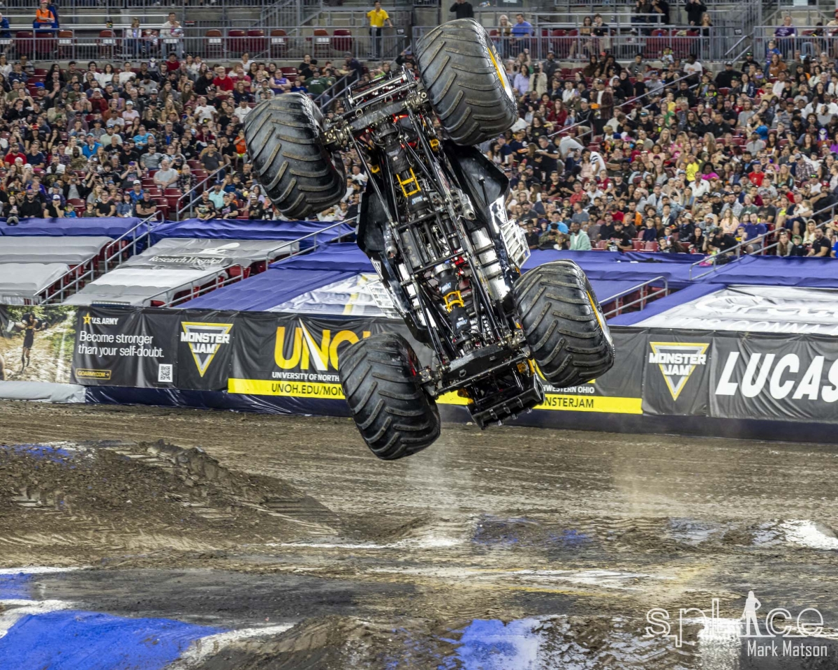 This nights show featured some of the wildest trucks you’ll ever see with larger than life names such as Grave Digger, JCB DIGatron, Max-D, Great Clips Mohawk Warrior, Megalodon, Bad Company, Black Pearl, Shaker, El Toro Loco, Lucas Stabilizer, Kraken, and Jester. These behemoths are seventeen feet long, stand over ten feet high and weigh some six tons. It’s no wonder they need some fifteen hundred horsepower to get them to quite literally fly around the course in the stadium.