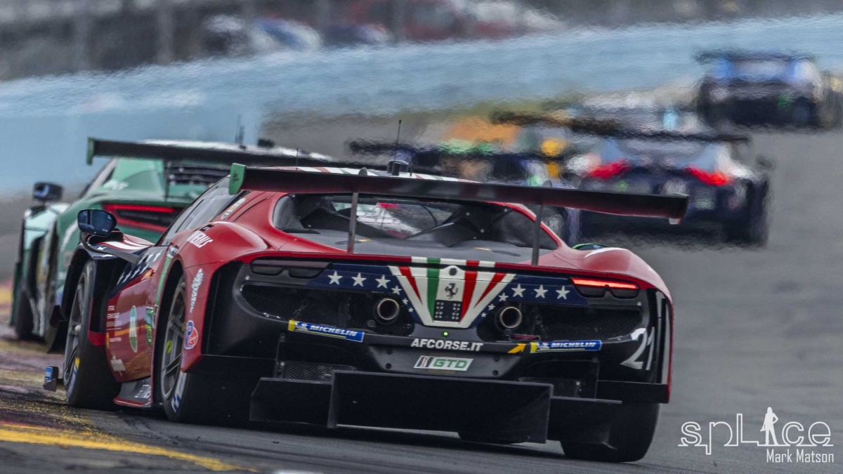 During the next full course caution caused by George Kurtz in the Crowdstrike by APR LMP2 that hit Roberto Lecorte’s Cetilar GTD Ferrari and put him into the fence at turn eight, the field dove into the pits for their first round of stops. At the restart Phillip Eng’s #24 BMW M Hybrid V8 was now leading the field.