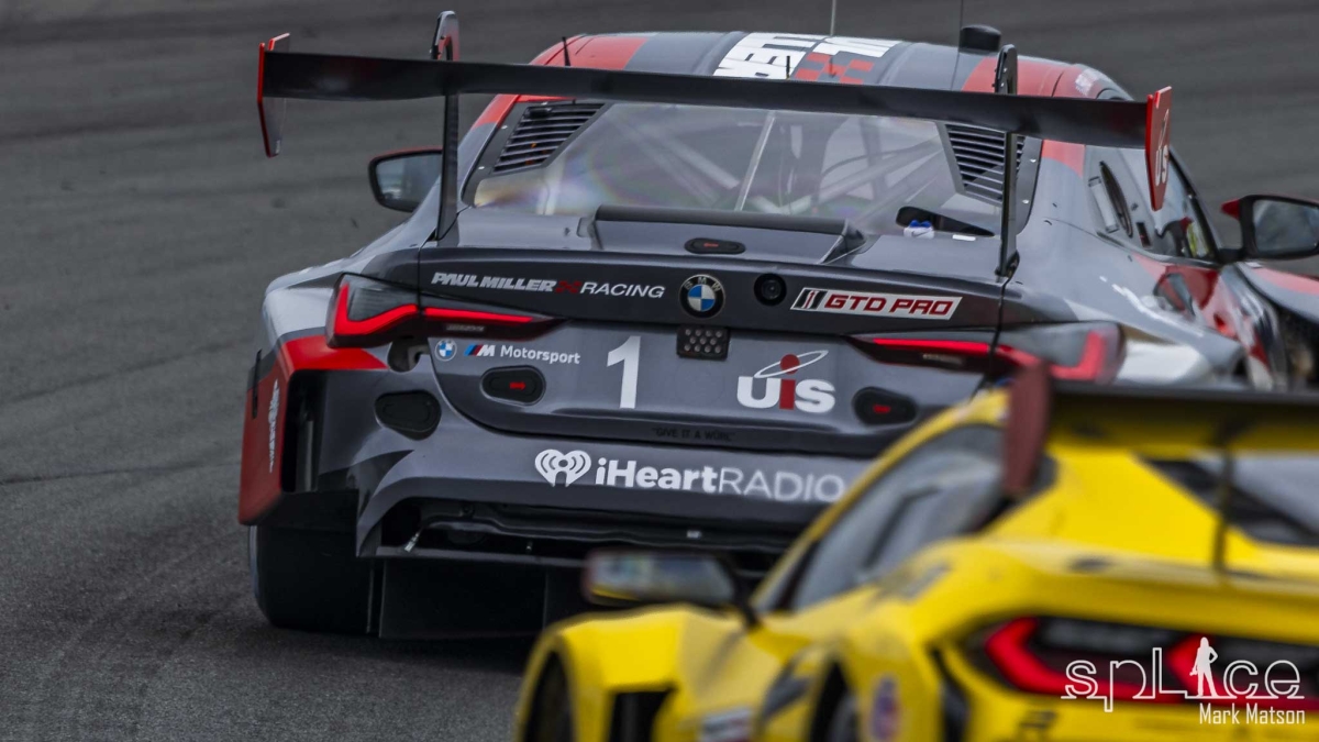 During the next full course caution caused by George Kurtz in the Crowdstrike by APR LMP2 that hit Roberto Lecorte’s Cetilar GTD Ferrari and put him into the fence at turn eight, the field dove into the pits for their first round of stops. At the restart Phillip Eng’s #24 BMW M Hybrid V8 was now leading the field.