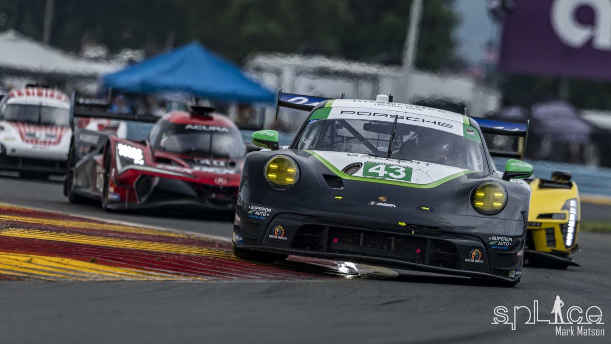 Finally, with forty minutes left in the race drivers made their way to their cars and the race was able to get back underway. The field followed the safety car for several laps until the track was dry enough for the cars to make the switch back to slick tires. During the changeover, Delatraz in his #40 Acura lead the race out of the pits, but Felipe Nasr in the #7 Porsche Penske was the big winner as he was now in second.