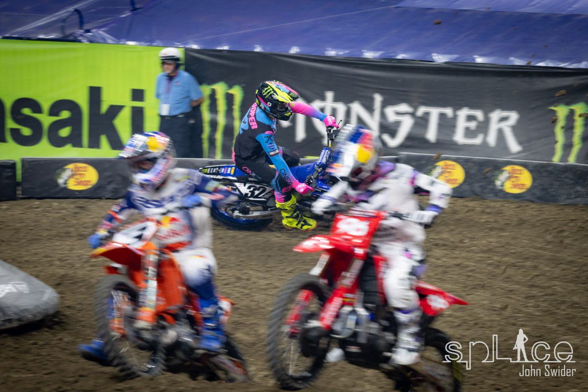 Roczen’s hopes of sweeping the night unraveled almost immediately when he mistimed a rhythm lane on the opening lap and came down on Red Bull KTM’s Aaron Plessinger, taking Plessinger out of the race and dropping Roczen to the back of the field.