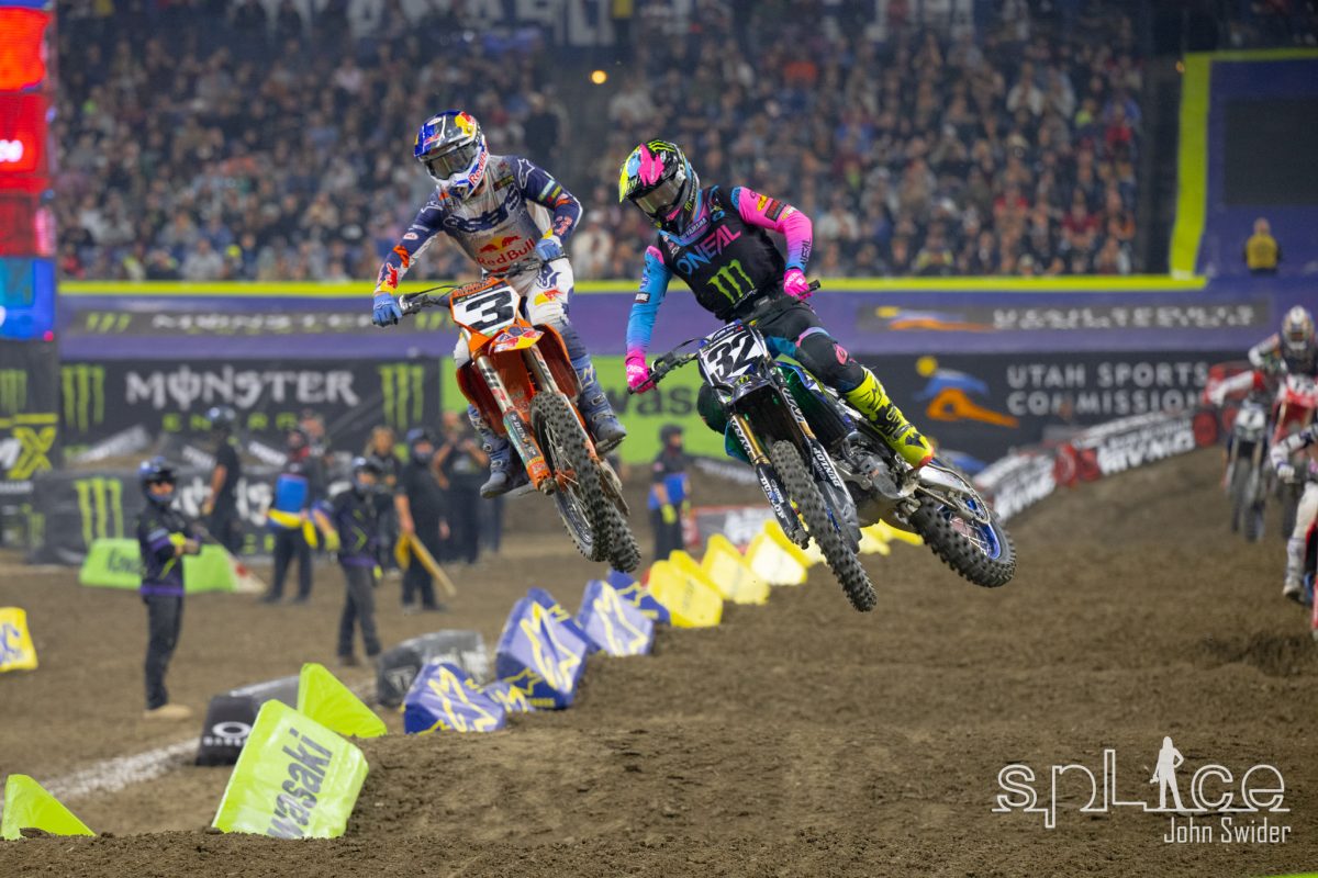 Roczen’s hopes of sweeping the night unraveled almost immediately when he mistimed a rhythm lane on the opening lap and came down on Red Bull KTM’s Aaron Plessinger, taking Plessinger out of the race and dropping Roczen to the back of the field.
