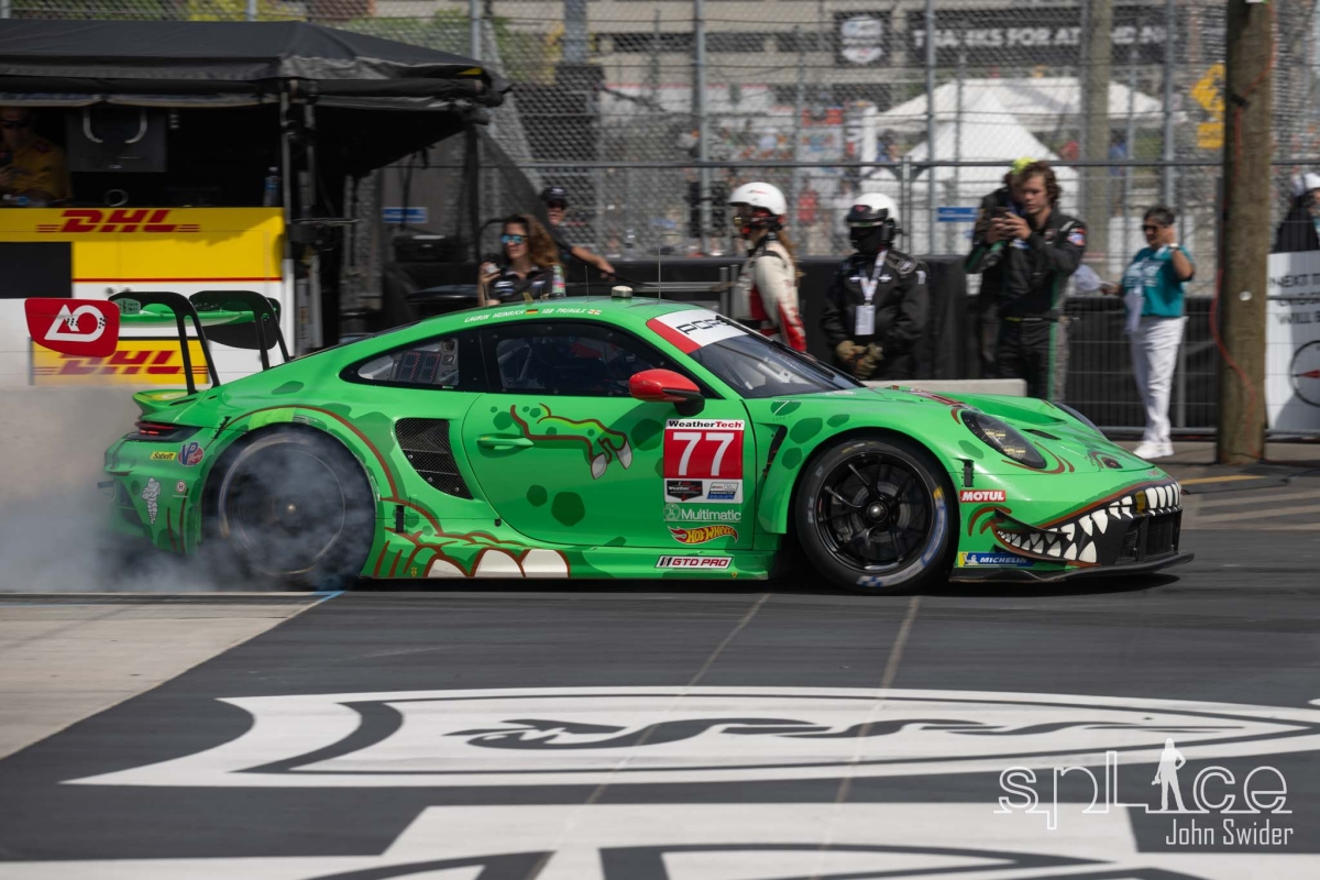In the absence at the front of the pole-winning No. 3 Corvette of Antonio Garcia, which fell back early with an alternator problem, the incident collected the eventual winning “Rexy” Porsche driver Laurin Heinrich. That will enable AO Racing to add another gold tooth to its T-Rex smile at the front end. The young German was able to hang on to give his teammate Seb Priaulx and team a second straight win despite the altered front end on his 911 GT3 R. “It sustained a bit of damage to the front and I had to change my driving style because the car kept wanting to slide straight ahead,” he said. “It worked.”