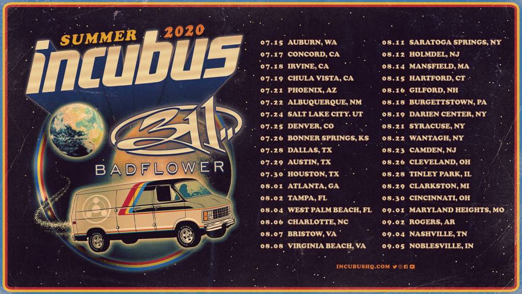 Live Nation (February 4, 2020) – Today, multi-platinum selling band Incubus has announced they will be hitting the road this summer on their upcoming North American amphitheater tour. Produced by Live Nation, the tour will kick off July 15 in Auburn, WA and will travel to 35+ cities across the country before concluding September 5 in Noblesville, IN. The Grammy-nominated band will be joined on the trek by alternative rock stalwarts 311, who are celebrating their 30th Anniversary in 2020 (and will play all 50 U.S. States over the year) and Badflower, who recently had two #1 songs at Rock Radio. This summer marks the first time in 20 years that Incubus and 311 have toured together. The band also announced the release of their highly anticipated new EP, Trust Fall (Side B), in April 2020. Pre-save the EP HERE.