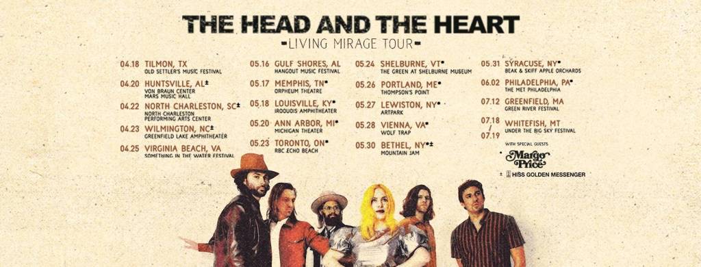 The Head and The Heart has announced a North American spring tour, #LivingMirageTour joined by special guest Margo Price, who has just released her excellent new single “Stone Me“. Hiss Golden Messenger will support the band on three shows in April. Pre-sale and general on sale info below. Produced by Live Nation, the outing will kick off April 18th in Tilmon, TX and make stops in Toronto, Portland, New York and more, before wrapping July 19th.