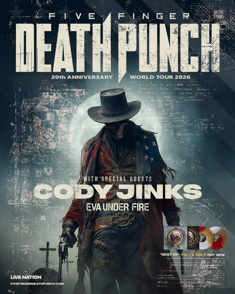 The band’s current albums, “Best Of – Volume 1” and “Best Of – Volume 2”, feature newly re-recorded versions of Five Finger Death Punch’s biggest hits, including the #1 single “I Refuse” feat. Maria Brink (Vol. 1) and #1 single “The End” feat. BABYMETAL (Vol. 2). “The End” reached #1 on the Japanese iTunes Metal Chart and #18 on the Japanese All-Genres Chart, marking a major milestone for an international rock release. In the U.S., the song made history as the first track featuring Japanese lyrics to chart at Rock Radio, ultimately reaching #1. Both albums were created in response to the sale of the band’s original masters, a decision made without their knowledge or opportunity to reclaim them. Stream / buy HERE. TICKETS: Tickets for the 2026 tour dates will be available starting with Artist and Citi presales beginning Wednesday, January 14. Additional presales will run throughout the week ahead of the general onsale beginning Friday, January 16 at 10am local time at LiveNation.com. For more information and VIP offerings, visit fivefingerdeathpunch.com. FIVE FINGER DEATH PUNCH 2026 TOUR DATES: Mon Jul 20 – Camden, NJ – Freedom Mortgage Pavilion Wed Jul 22 – Bangor, ME – Maine Savings Amphitheater Thu Jul 23 – Saratoga Springs, NY – Saratoga Performing Arts Center Sat Jul 25 – Hershey, PA – Hersheypark Stadium Sun Jul 26 – Syracuse, NY – Empower Federal Credit Union Amphitheater at Lakeview Tue Jul 28 – Gilford, NH – BankNH Pavilion Thu Jul 30 – Mansfield, MA – Xfinity Center Sat Aug 01 – Montreal, QC – Centre Bell Sun Aug 02 – Toronto, ON – RBC Amphitheatre Tue Aug 04 – Wantagh, NY – Northwell at Jones Beach Theater Wed Aug 05 – Holmdel, NJ – PNC Bank Arts Center Fri Aug 07 – Burgettstown, PA – The Pavilion at Star Lake Sat Aug 08 – Noblesville, IN – Ruoff Music Center Mon Aug 10 – Cincinnati, OH – Riverbend Music Center Tue Aug 11 – Cuyahoga Falls, OH – Blossom Music Center Thu Aug 13 – Milwaukee, WI – American Family Insurance Amphitheater Sat Aug 15 – Grand Rapids, MI – Acrisure Amphitheater Sun Aug 16 – Clarkston, MI – Pine Knob Music Theatre Tue Aug 18 – Shakopee, MN – Mystic Lake Amphitheater Wed Aug 19 – Tinley Park, IL – Credit Union 1 Amphitheatre Fri Aug 21 – Saint Louis, MO – Hollywood Casino Amphitheater Tue Sep 08 – Morrison, CO – Red Rocks Amphitheatre Fri Sep 11 – Auburn, WA – White River Amphitheatre Sat Sep 12 – Ridgefield, WA – Cascades Amphitheater Mon Sep 14 – Wheatland, CA – Toyota Amphitheatre Wed Sep 16 – Mountain View, CA – Shoreline Amphitheatre Fri Sep 18 – Long Beach, CA – Long Beach Amphitheater Sat Sep 19 – Las Vegas, NV – Michelob ULTRA Arena Tue Sep 22 – Salt Lake City, UT – Utah First Credit Union Amphitheatre Thu Sep 24 – Phoenix, AZ – Talking Stick Resort Amphitheatre* Fri Sep 25 – Albuquerque, NM – Isleta Amphitheater* Sun Sep 27 – Houston, TX – Cynthia Woods Mitchell Pavilion Mon Sep 28 – Austin, TX – Germania Insurance Amphitheater Wed Sep 30 – Fort Worth, TX – Dickies Arena Fri Oct 02 – Rogers, AR – Walmart AMP Sat Oct 03 – Kansas City, MO – Morton Amphitheater Mon Oct 05 – Biloxi, MS – Mississippi Coast Coliseum Wed Oct 07 – Huntsville, AL – Orion Amphitheater Thu Oct 08 – Franklin, TN – FirstBank Amphitheater Sat Oct 10 – Tampa, FL – MIDFLORIDA Credit Union Amphitheatre Sun Oct 11 – West Palm Beach, FL – iTHINK Financial Amphitheatre Tue Oct 13 – Alpharetta, GA – Ameris Bank Amphitheatre Wed Oct 14 – Raleigh, NC – Coastal Credit Union Music Park at Walnut Creek Fri Oct 16 – Charlotte, NC – Truliant Amphitheater Sat Oct 17 – Virginia Beach, VA – Veterans United Home Loans Amphitheater at Virginia Beach Mon Oct 19 – Greenville, SC – Bon Secours Wellness Arena Wed Oct 21 – Columbus, OH – Nationwide Arena Fri Oct 23 – Bristow, VA – Jiffy Lube Live *Without Cody Jinks